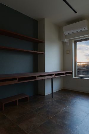 例えばデスク上部の棚板はブラケットなどの支え金物などは使用せず、隠し金物を仕込みスッキリとした印象に仕上げています。またデスク本体もなるべく軽やかな印象にするために基本は脚をつけず壁面に固定し強度を確保しています。ただしこれだけの重量になると、どうしても強度的な懸念がありますので一本だけ脚を入れさせてもらいました。この脚も鉄製のものを特注し細くシャープに仕上げています。