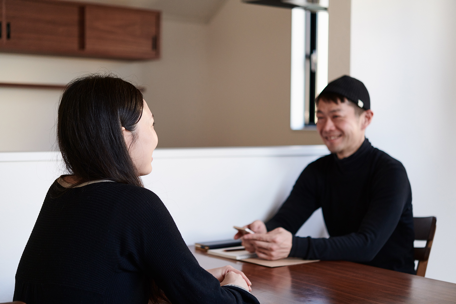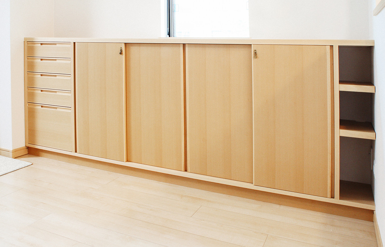 「座れる収納と壁面デスク」で家族みんなが集まるリビングに。