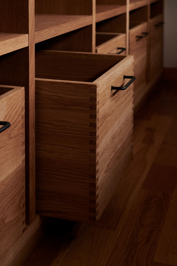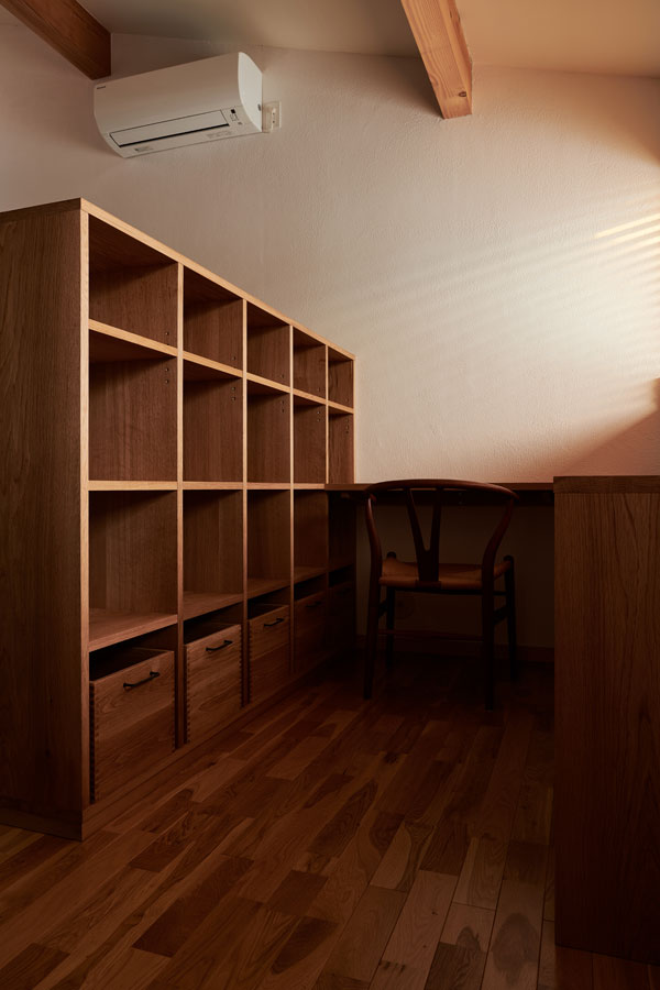 本棚はシンプルなグリッド構成となっていますが、最下段に引き出し箱を設けて収納としての汎用性も考慮致しました。