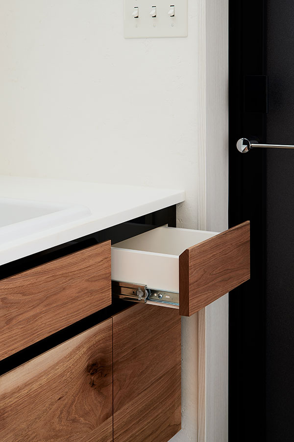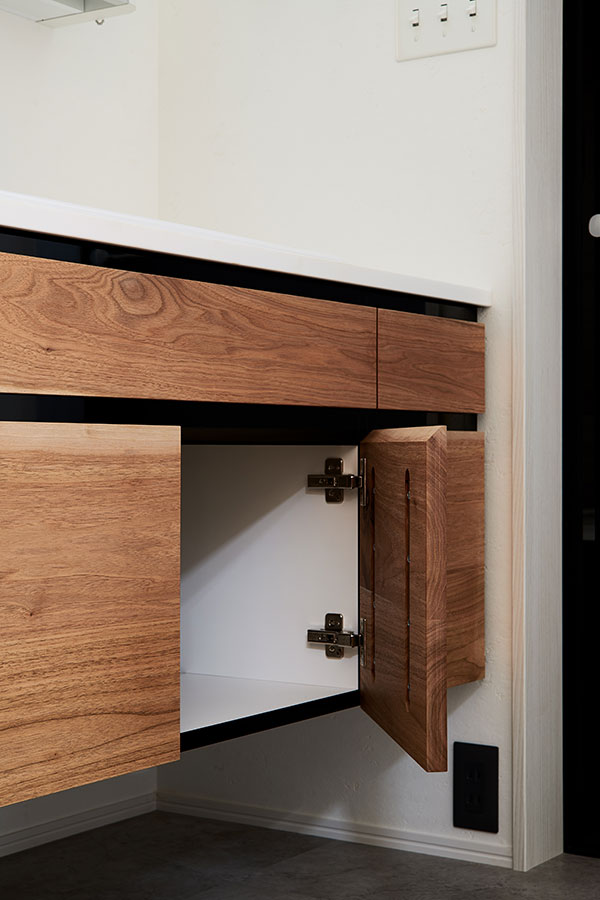今回は事前に無垢材を使用した洗面台のイメージを共有して頂いていたので、引き出しの前板にクルミの無垢材を使用しデザインをご提案させていただきました。水への耐性アップやメンテナンス性向上のために内部や本体の箱は化粧板を使用していますがフロントが全て無垢材なのでやはり重厚感があります。