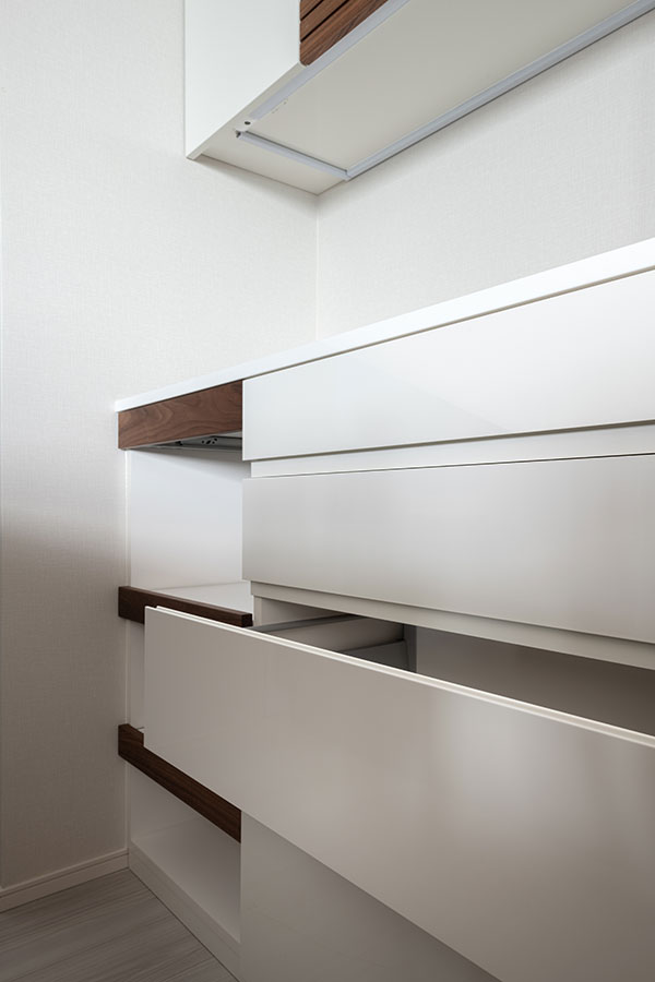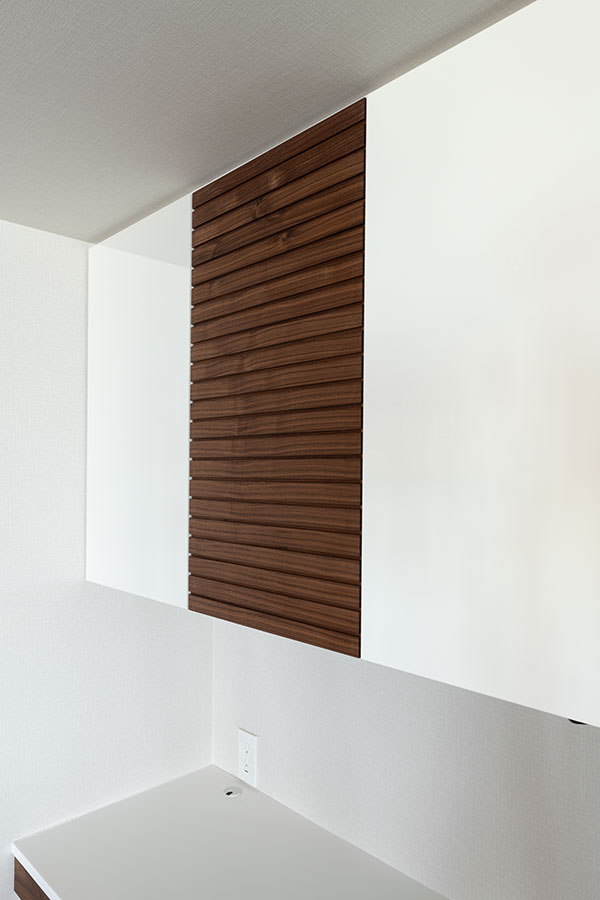 アクセントとして一部の扉部分には無垢材を使用し清潔感の中にも木の温かみを感じるデザインとなりました。