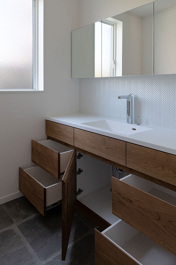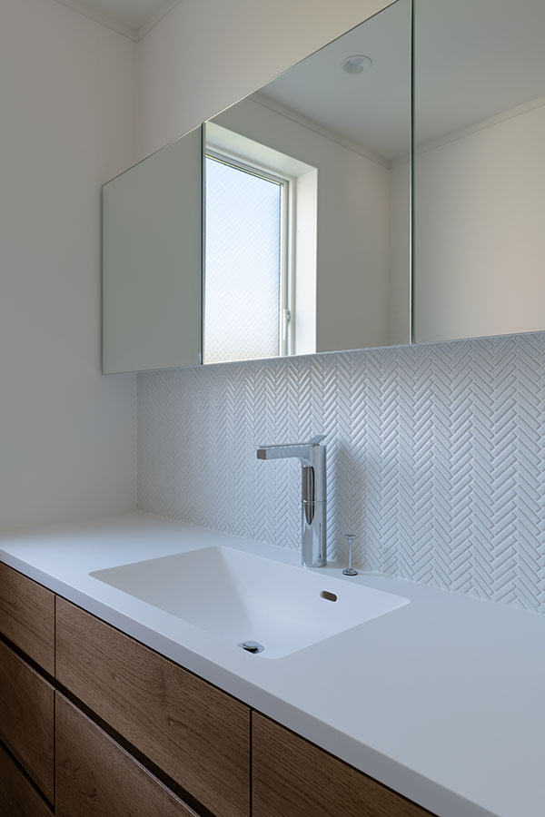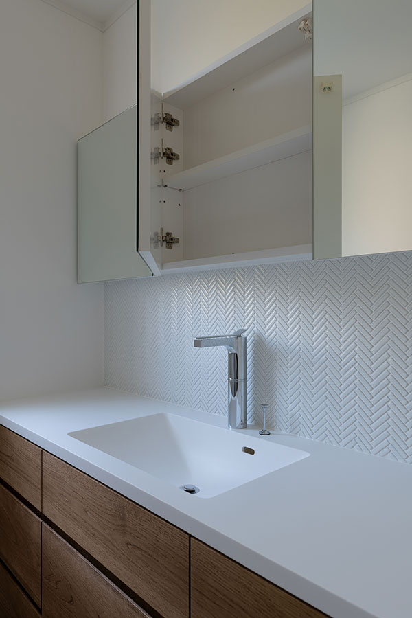 キッチン同様に洗面台も当然ながらハードに水を使用します。今回は水に強くメンテナンス性に優れ高級感もあるので洗面台のみならずキッチン天板やテーブル天板など幅広く用いられる人工大理石を使用しました。キャビネットが落ち着いたトーンの木製なので清潔感のある白の人工大理石をチョイス。