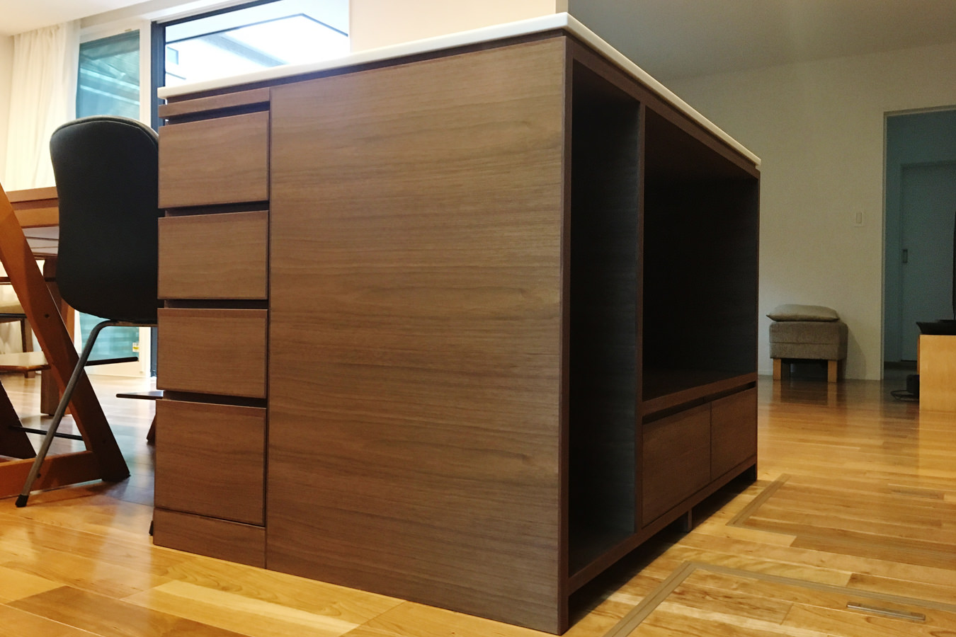 豊かな自然が望める窓辺に設置するカウンターテーブルをご依頼頂きました。ご主人の仕事用のデスクや将来的にはお子様の勉強デスクとしてなど
