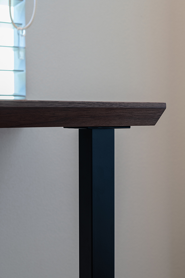 多様な使用シーンを想定してのご依頼でした。天板の手前に取られた切り面(斜めに削られている部分)は天板の厚みを感じさせずシャープな印象を生み出します。