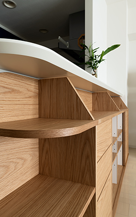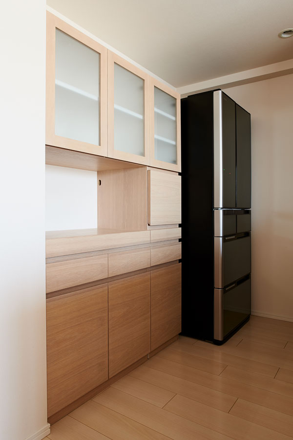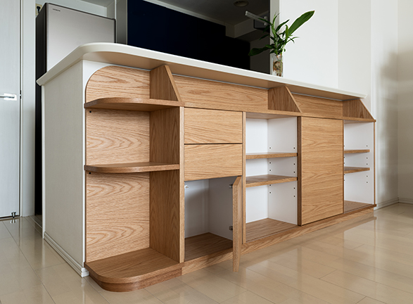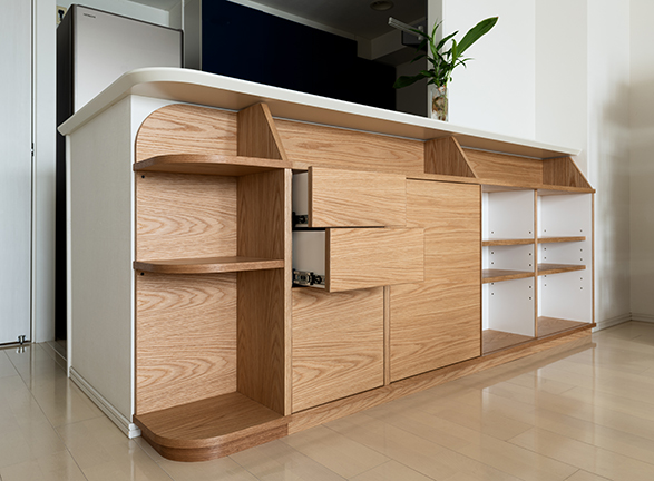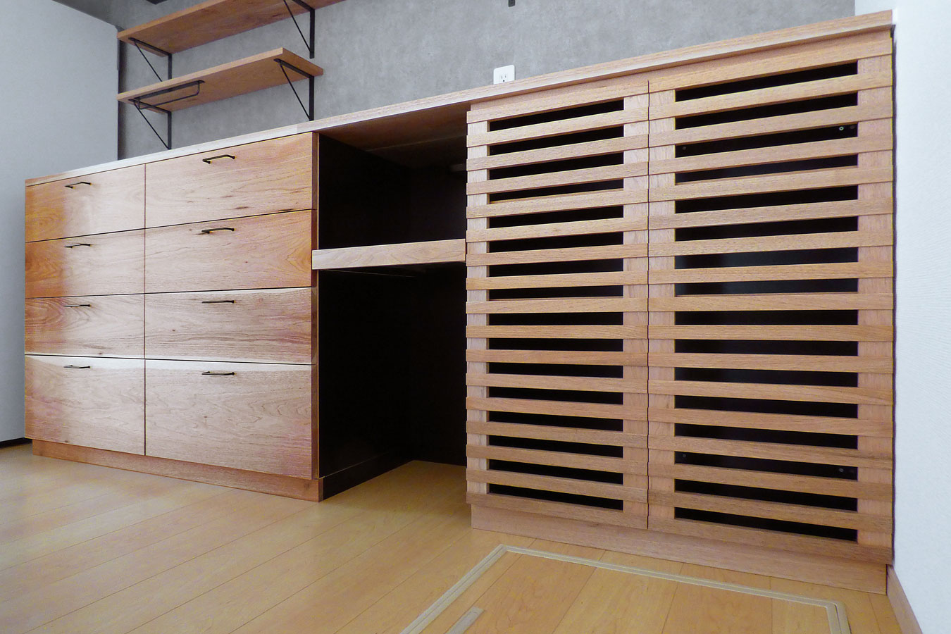 収納の開け閉めが可能となります。こちらのお客様のケースではさらにオープンスペースや引き出しなども必要に応じて設けています。
