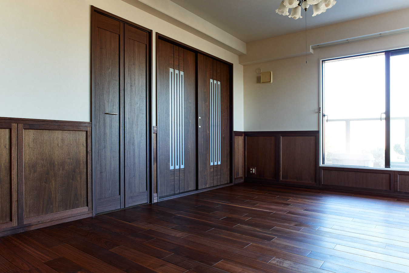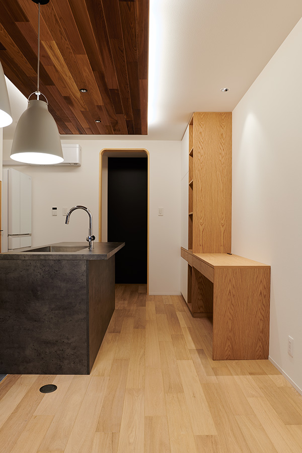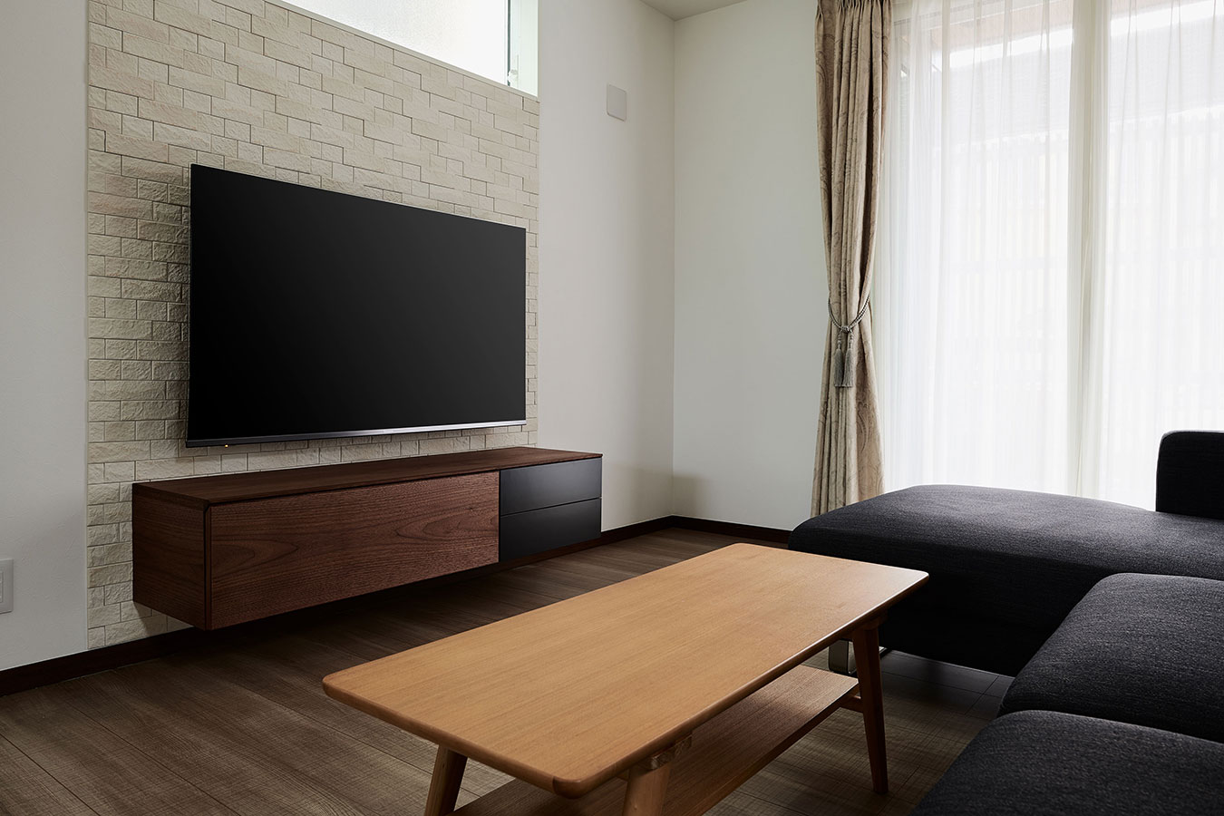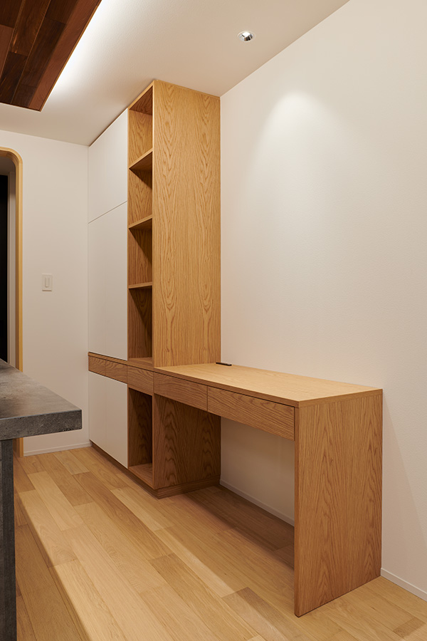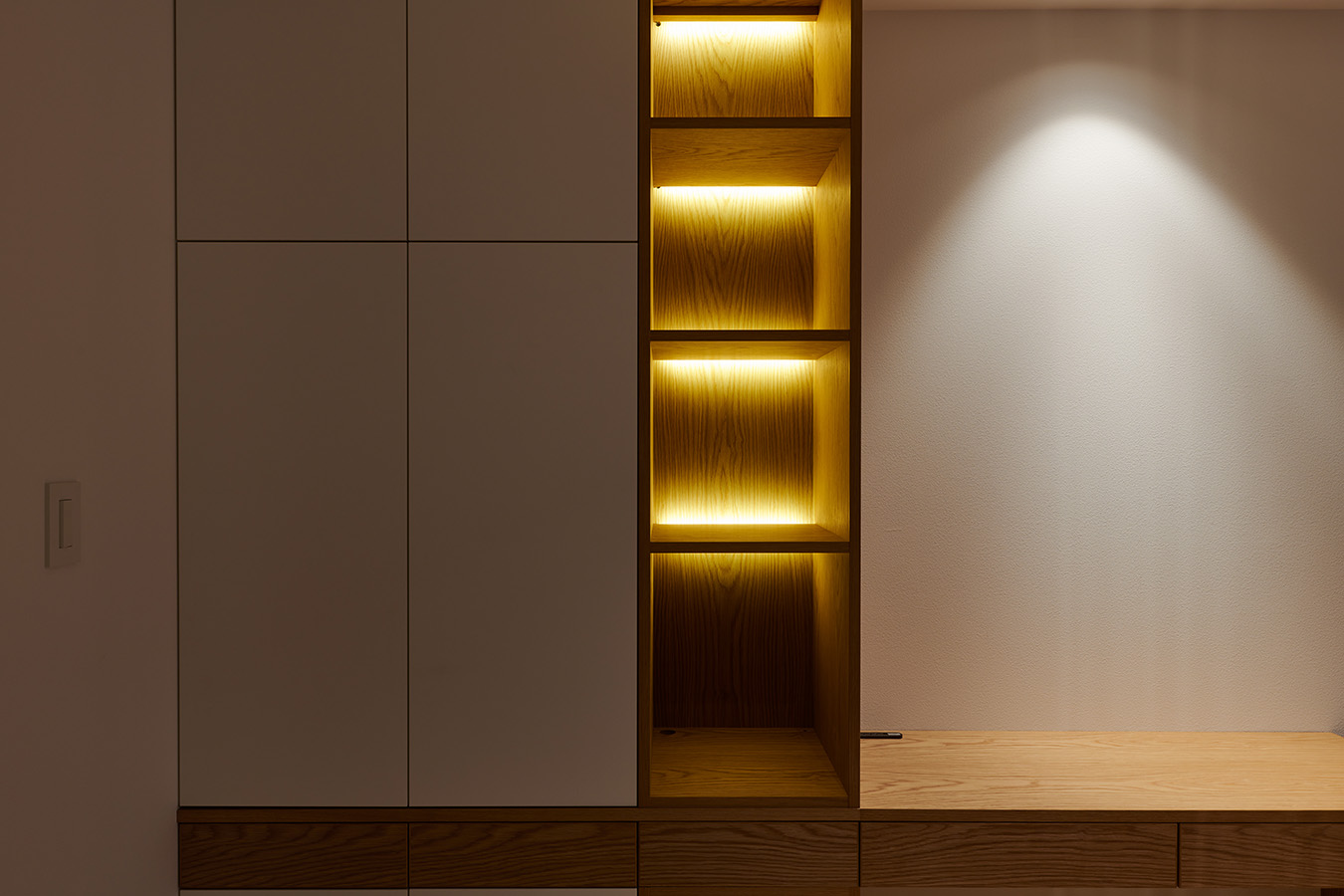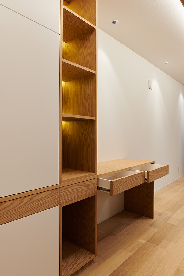 デスクが隣に設置される為ネット関連を含めた電気配線、収納内照明の配線などもスマートに隠して収納できる設計になりました。