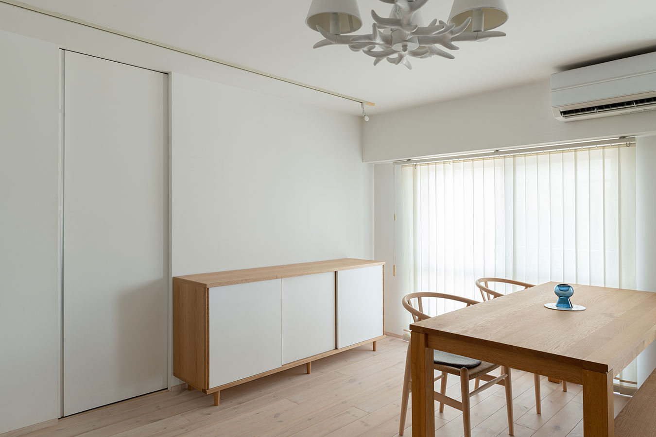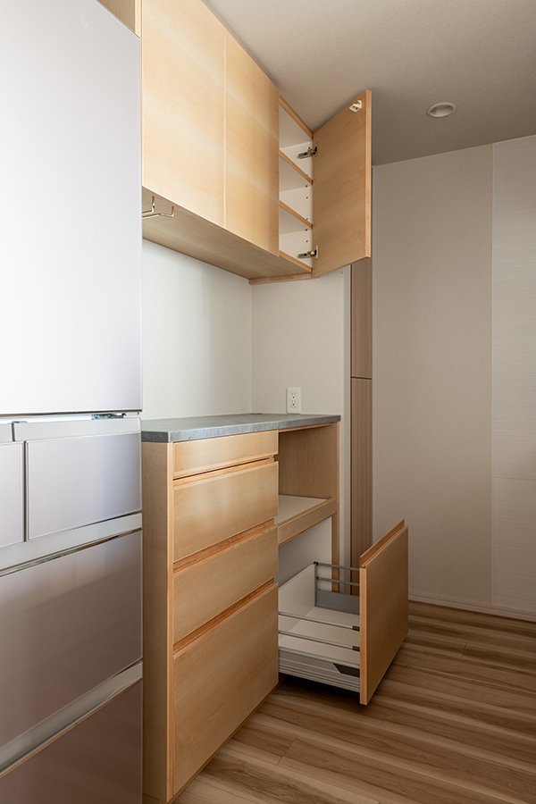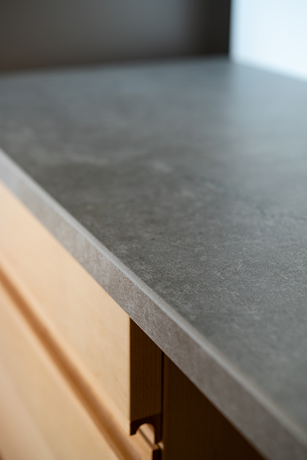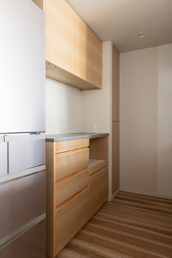 今回のお客様はキッチン収納にメープルを選定し、キャビネット部分の天板には水にも強いモルタル調のセラミックストーンをアクセントに