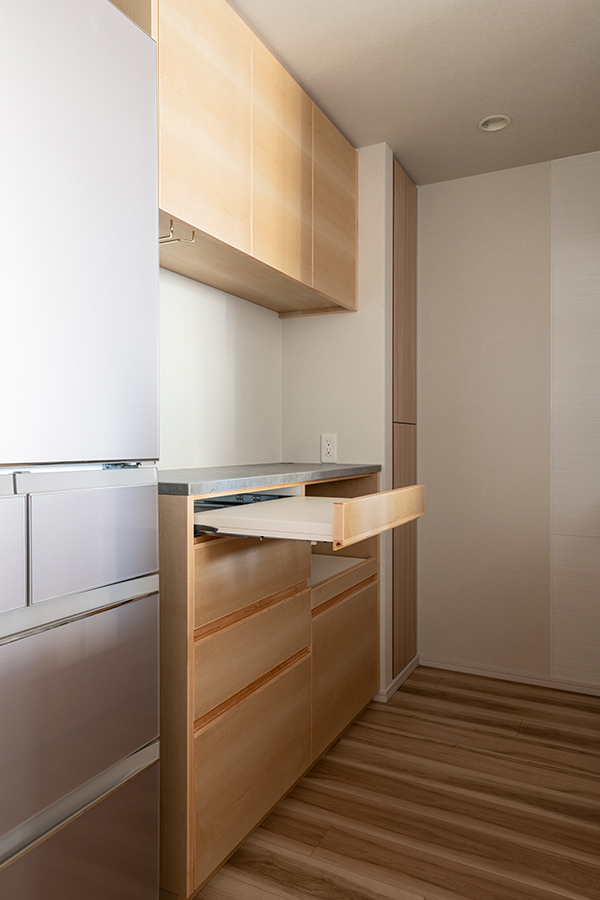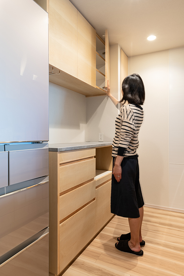しています。メープルの雰囲気が柔らかい印象をキッチン全体に生み出しています。