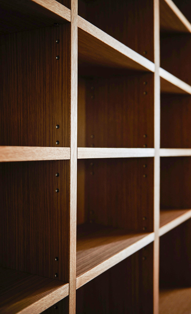 構成自体はとてもシンプルな本棚ですが、棚の寸法の割り振りや配線経路の取り方などをお客様と収納計画を含め入念に話し合いながら設計を進めていきました。