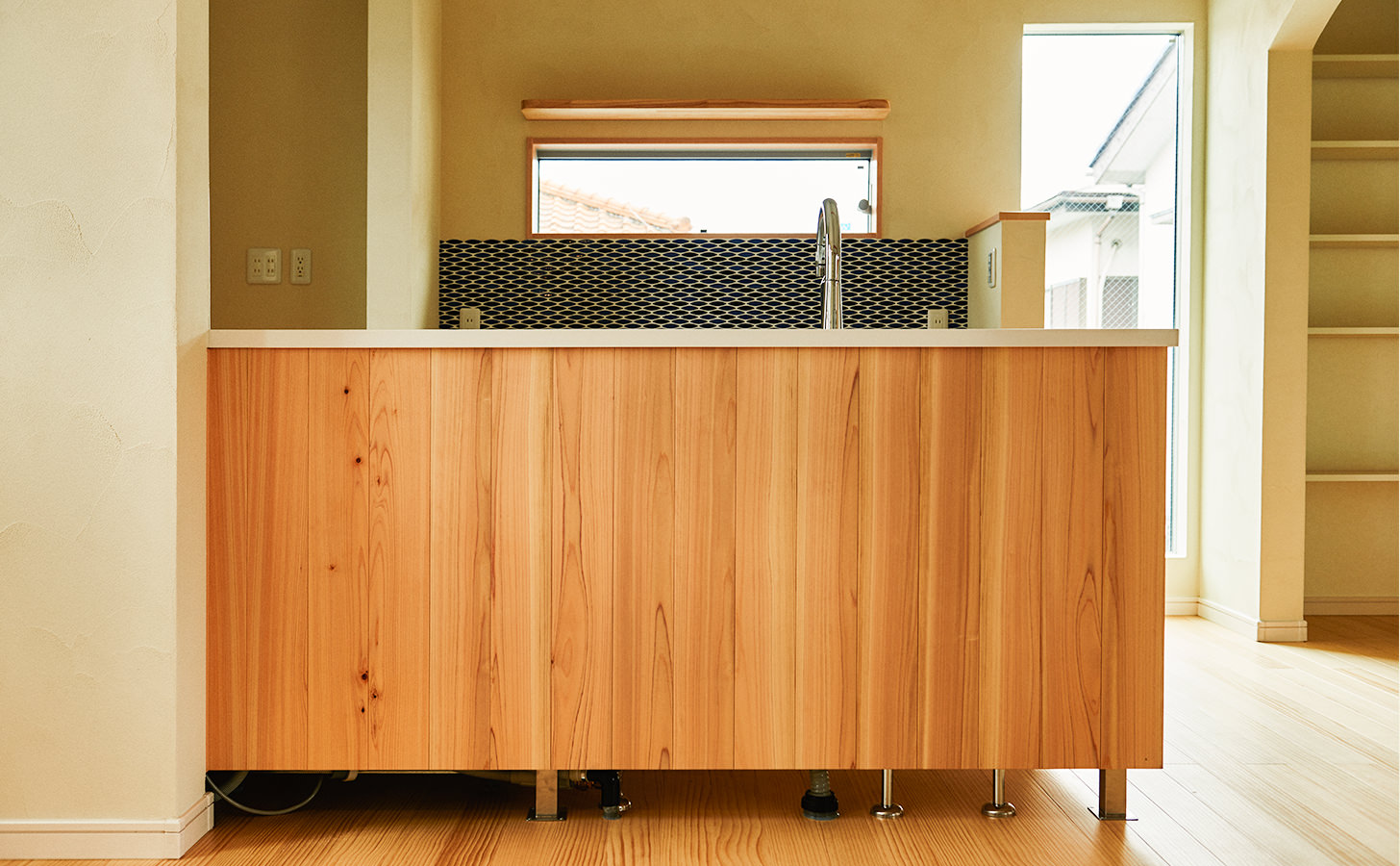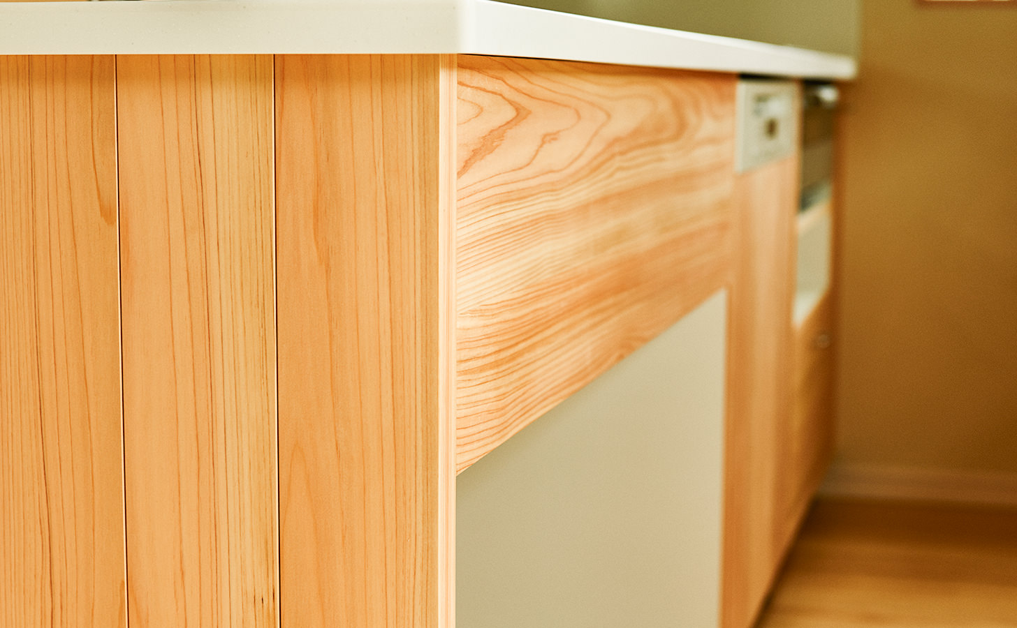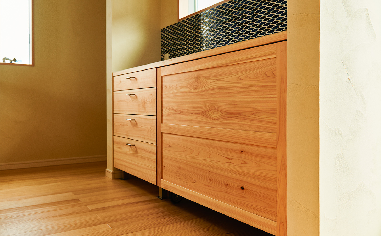 今回もなるべく無垢材を使い木の質感を活かしたいというオーダーでしたので上記のようなヒノキを使用し構成しております。ただし、メンテナンスや日頃の使い勝手を考慮し天板は人工大理石とし収納内部は掃除のしやすいポリエステル化粧板をご提案致しました。