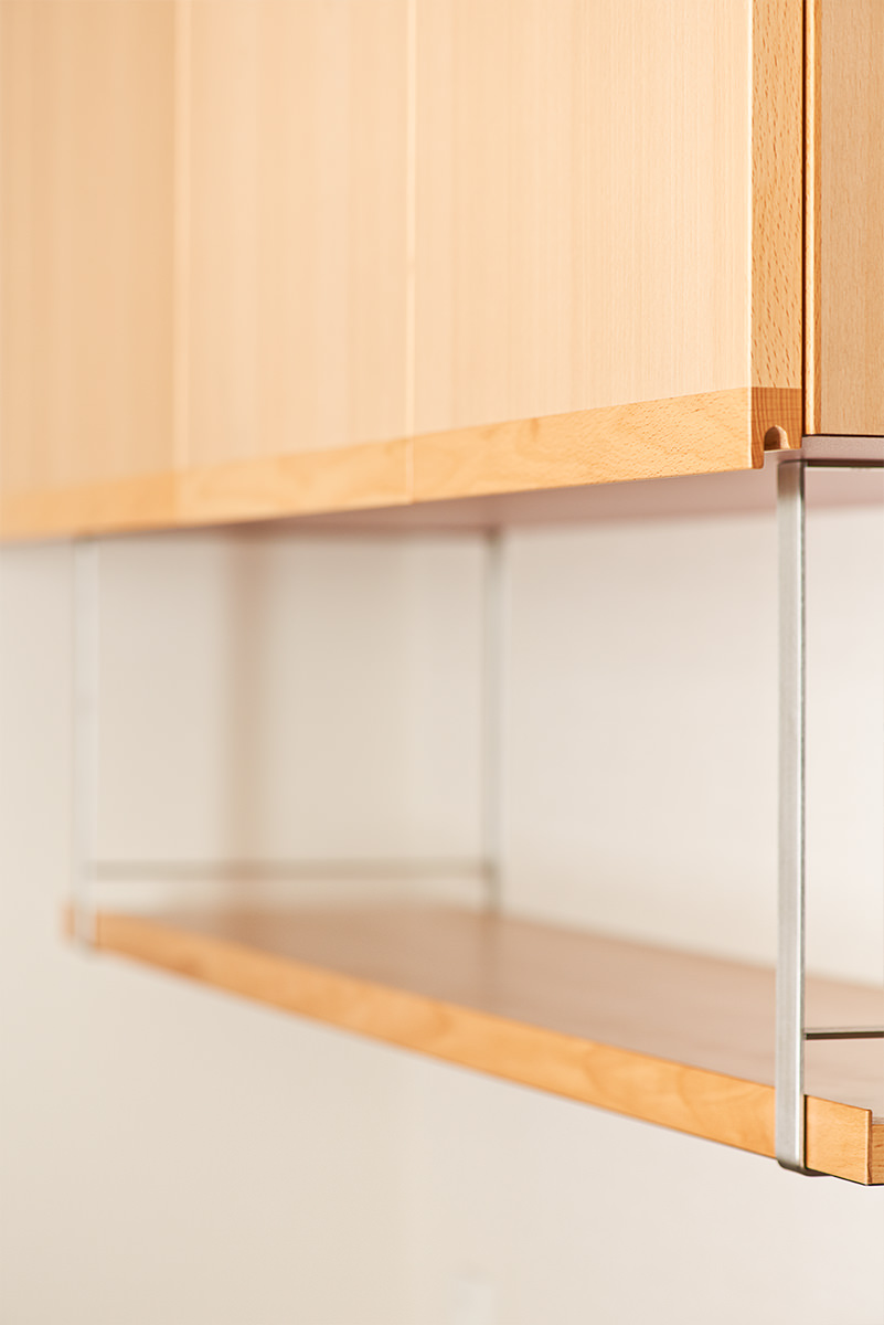 収納するものなどは使いながら考えるとの事でなるべく用途を限定しないように寸法を割り振りました。木質の素材感をご希望されていましたのでブナの突き板を使用し温かみのある雰囲気をだしながらもステンレスを織り交ぜる事でシャープな印象のデザインに仕上がりました。また手掛け部分には本体と微妙に色味を変えた無垢材を使用しアクセントとしています。