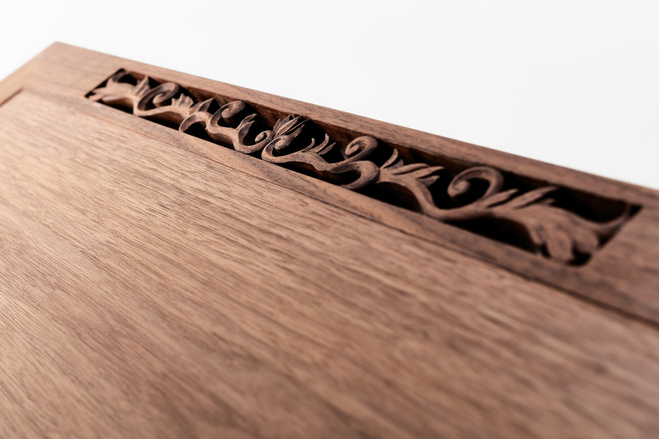 収納するものなどは使いながら考えるとの事でなるべく用途を限定しないように寸法を割り振りました。木質の素材感をご希望されていましたのでブナの突き板を使用し温かみのある雰囲気をだしながらもステンレスを織り交ぜる事でシャープな印象のデザインに仕上がりました。また手掛け部分には本体と微妙に色味を変えた無垢材を使用しアクセントとしています。