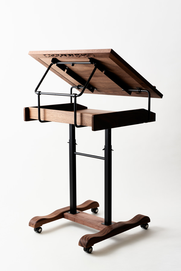 譜面台は楽譜を乗せる面版に角度調整の機能を持たせ脚部分は高さも変えられるように昇降機能付きとなっています。また面版上部にはクラシカルな印象を強めるため唐草の彫刻を手作業で行い非常に手間のかかった一品となっています。