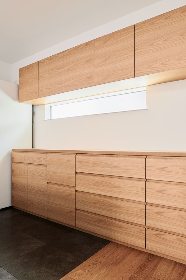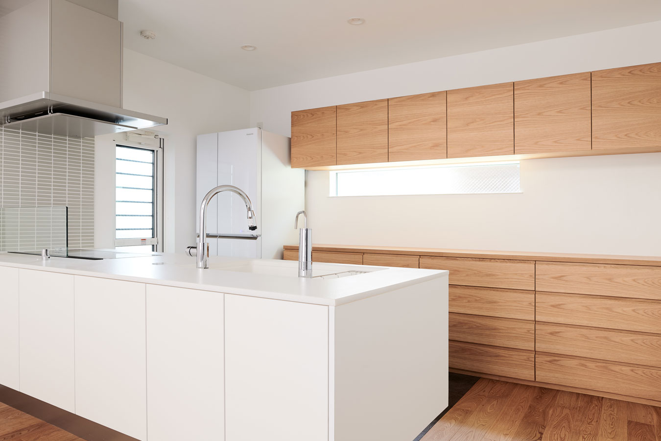 リビング、ダイニング、キッチンがシームレスに連なる間取りとなっている室内に同素材の家具が並ぶことでより一体感のある空間となりました。
