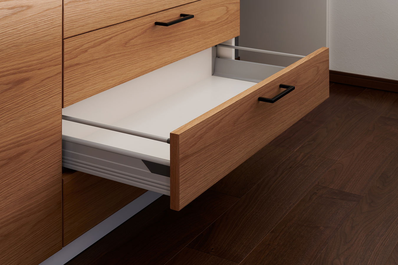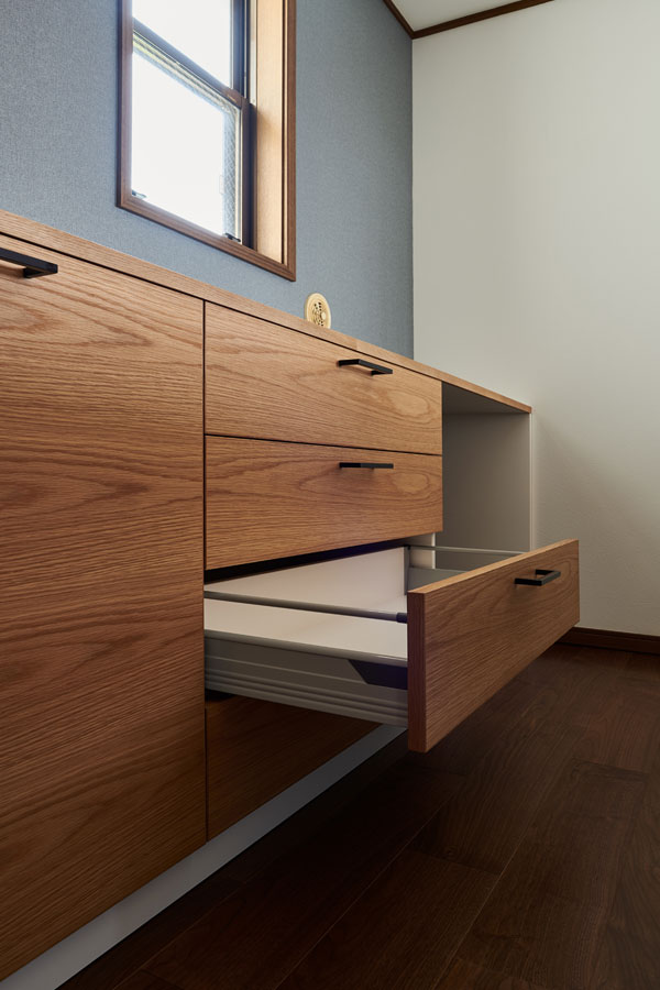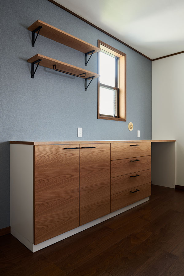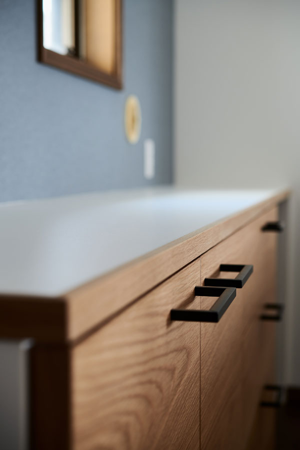 突板と化粧板を合わせたデザインはフラットな印象の化粧板が木の印象を軽やかなものにしてくれるので「木の質感は好きだけど木の印象が強すぎるのはちょっとなあ。。」という方にオススメです。