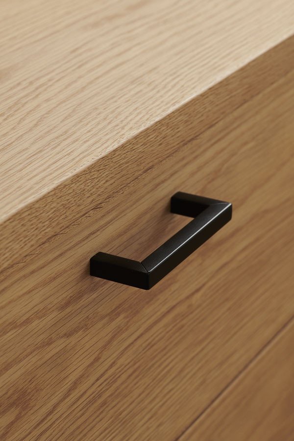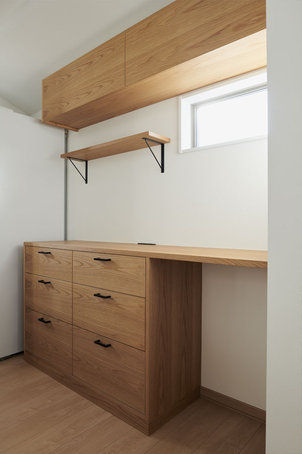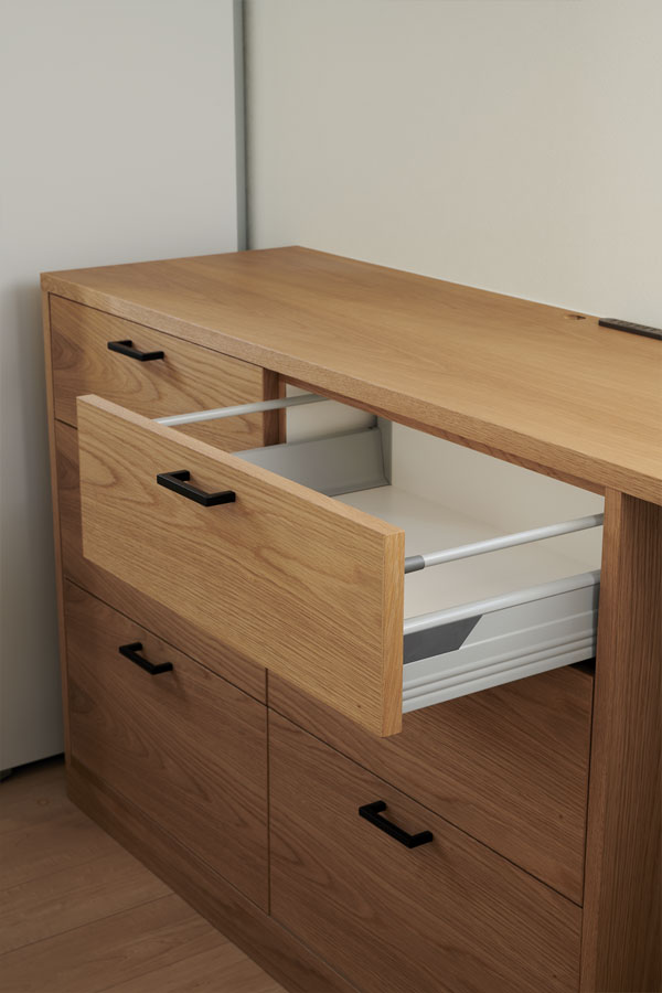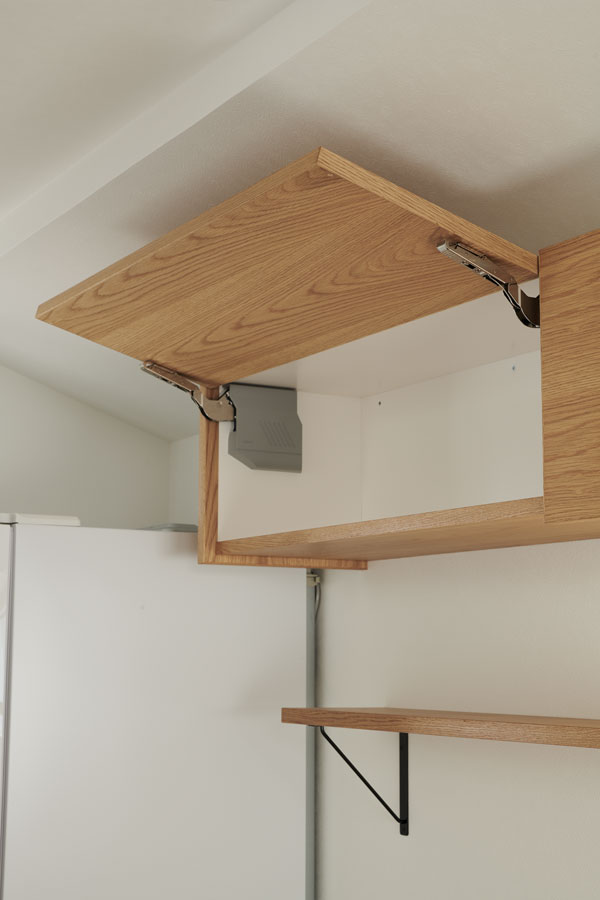 天井高が2000mm程度と低めの設置場所でしたので吊り戸棚は扉を開いた時に邪魔になりずらい跳ね上げ式を採用しました。キャビネットは引き出しをメインとした構成となっており使い方を選ばないデザインとなっています。