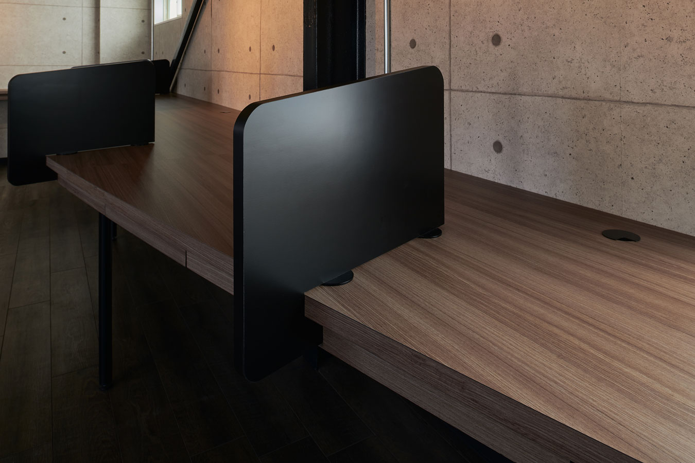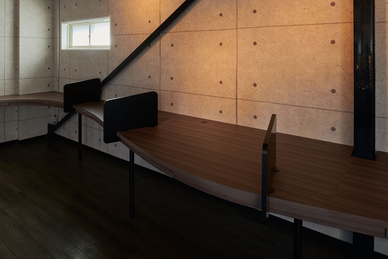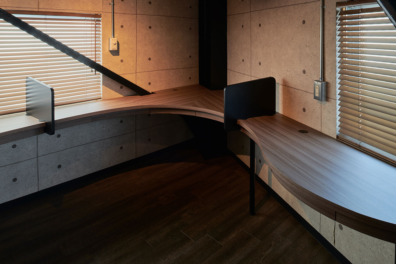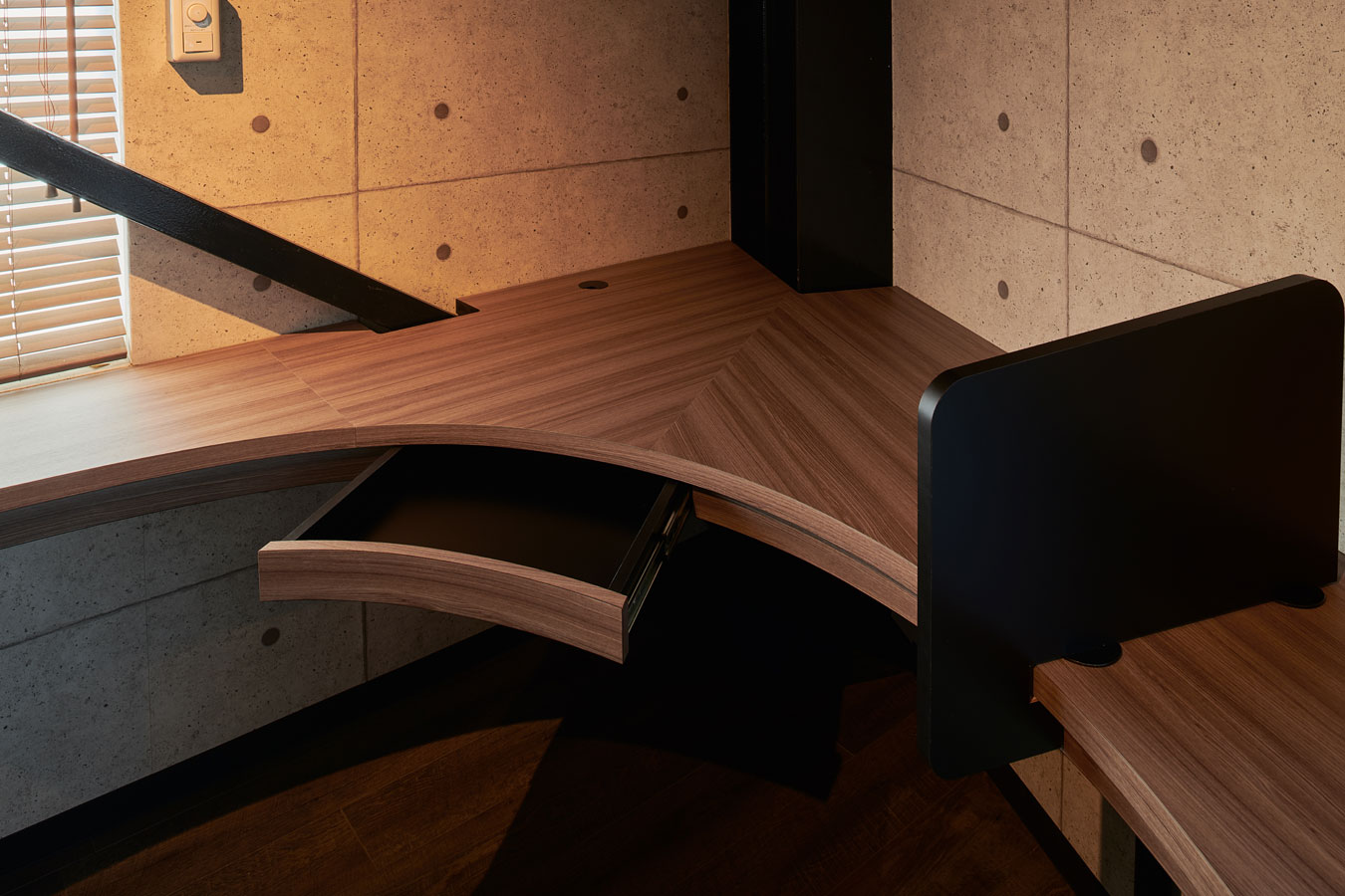 緩やかに連なる曲線形状が特徴で、壁を沿うように設置される事で空間に一体感を生み出しています。一見すると天板のみの簡易的なデスクに見えるますが曲線形状にあわせて引き出しも仕込まれておりオフィス用途における実用的な仕様となっています。