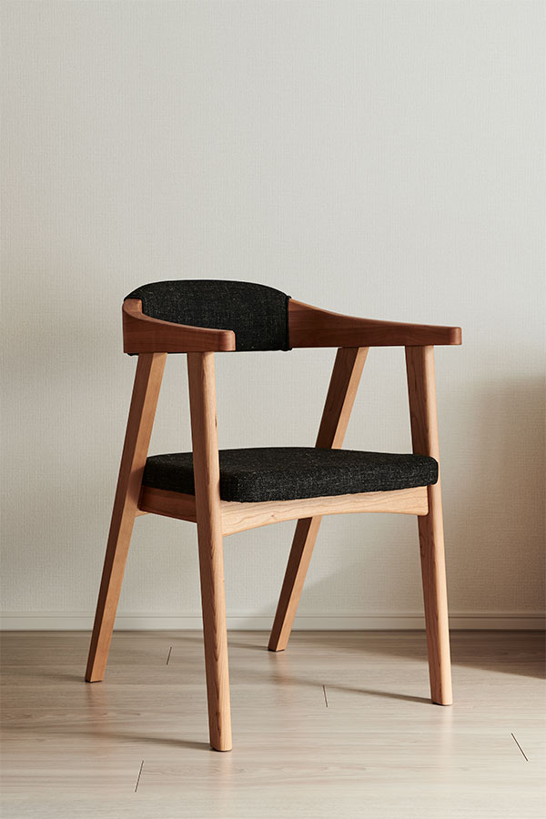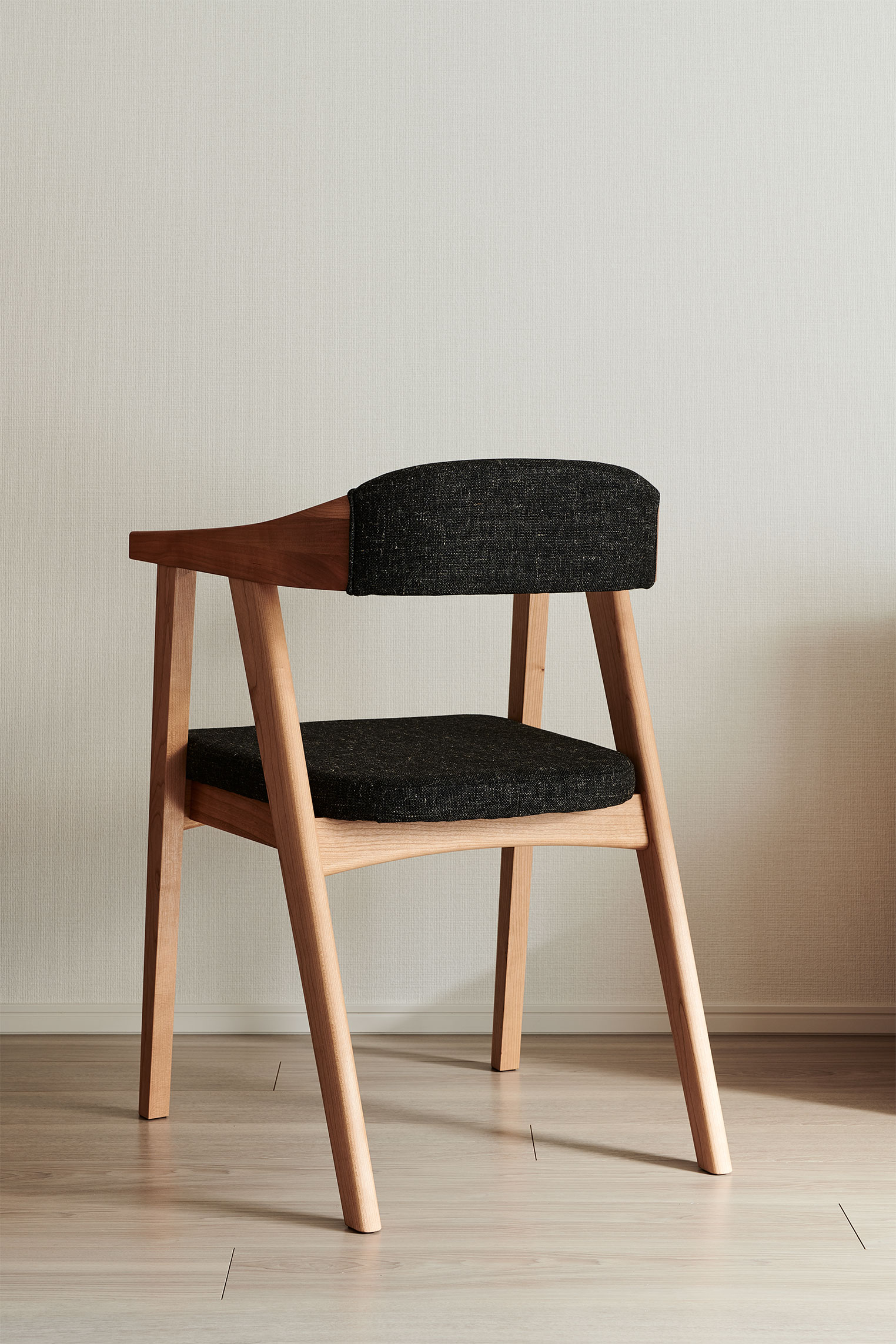 チェアは日本の住宅のサイズ感にフィットするように少し小ぶりなサイズ感となっており、空間の中でも圧迫感をかんじさせない曲線的なデザインを心がけました。対照的にダイニングテーブルは直線的なデザインとなっておりチェアと配置した時にコントラストが際立ち端正な印象のダイニング空間となるデザインを目指した。