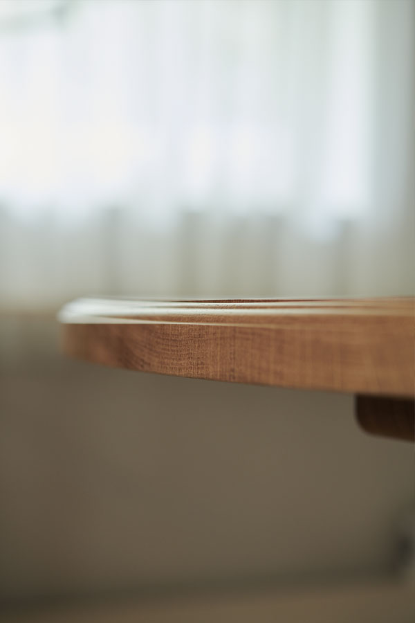ダイニングテーブルは丸天板のクラシカルなデザインをご希望でしたので挽物と呼ばれる木材を削り込む木工技術で支柱部分を制作し、天板のエッジ部分にも様式的なデザインを施しました。