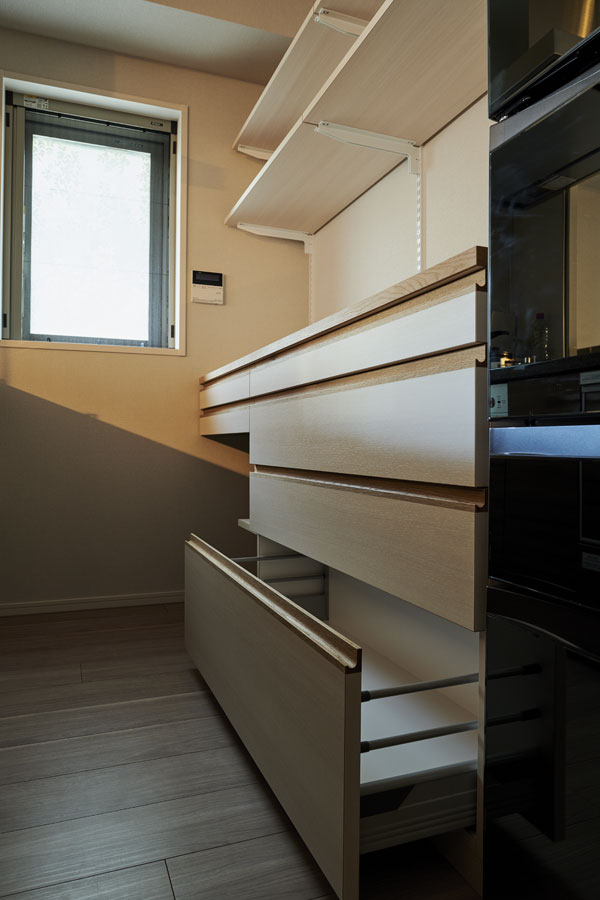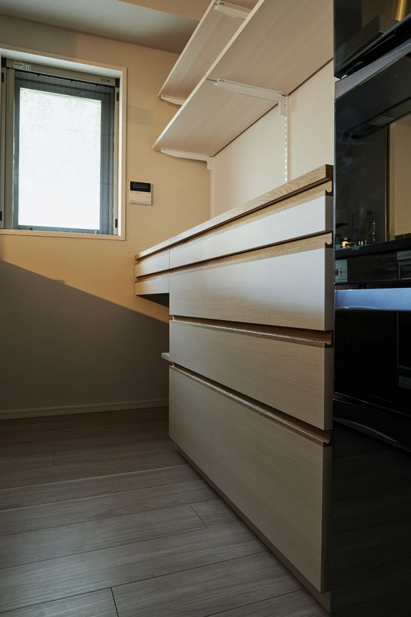キッチン収納は下台部分は引き出しをメインに構成されていますが、上部はいわゆる「ガチャ柱」で固定された高さ稼働の可能な棚板のみとなっており頻繁に仕様するものがスムーズにストックできるデザインとなっています。