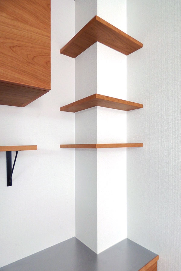 通常ですと柱部分は干渉しないように家具を作るといった事をするのですが、今回は柱を有効利用し、飾り棚をとりつけました。しかもこの飾り棚、支える為の金物などが付いていないのがおわかりでしょうか?木の桟を棚板に飲み込ませるような形で取り付けているので、ブラケットといったようなものが必要なく、とてもスッキリとしたデザインとなっています。